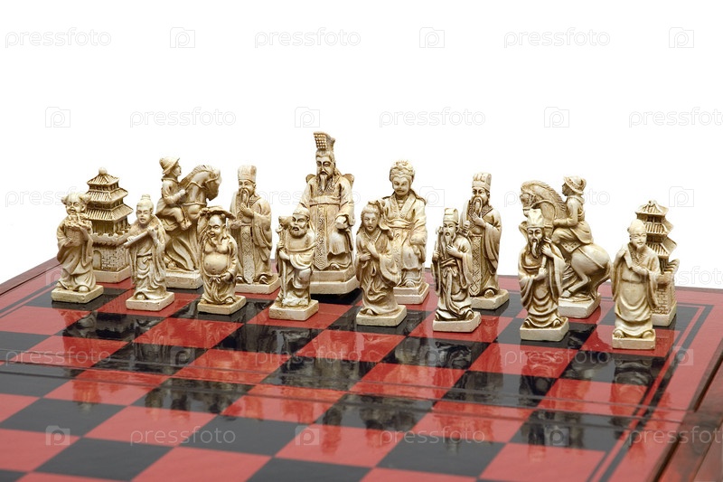 Белые шахматные фигуры расставлены на красной шахматной доске на белом фоне