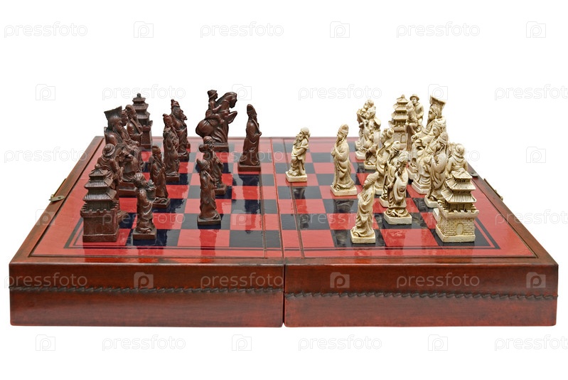 Черные и белые шахматные фигуры на красной шахматной доске в процессе игры на белом фоне