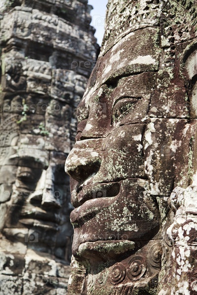 Профиль и анфас лица в кхмерском храме Байон храмового комплекса Ангкор, Сием Риап, Камбоджа
