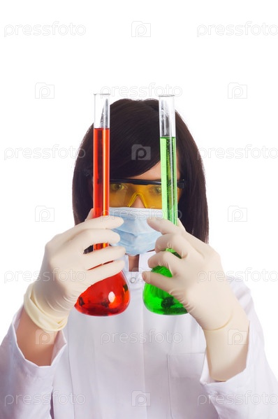 Женщина с химическими колбами в руках