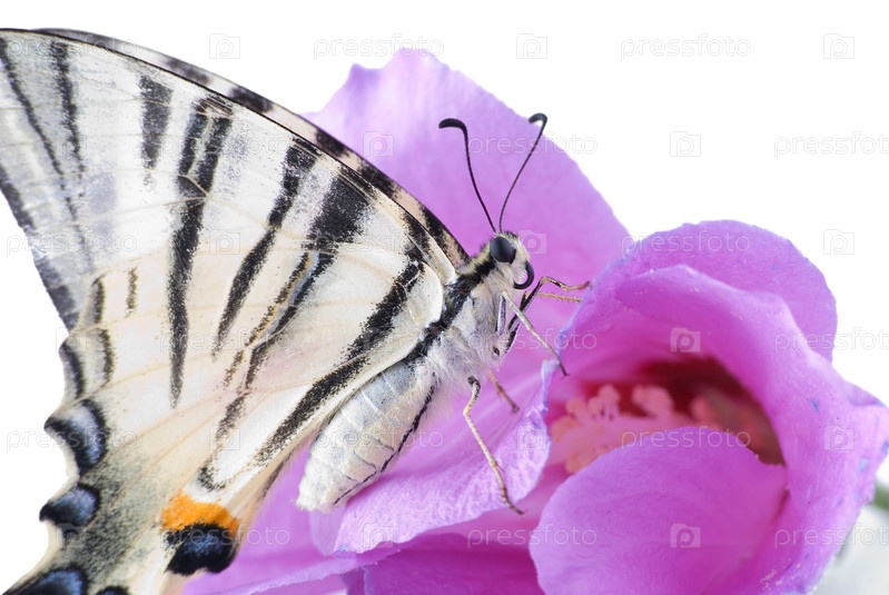 Черно-белая полосатая бабочка на розовом цветке на белом фоне