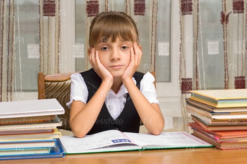Девочка сидит за столом с открытой книгой, подперев голову руками, среди учебников на фоне зашторенного окна