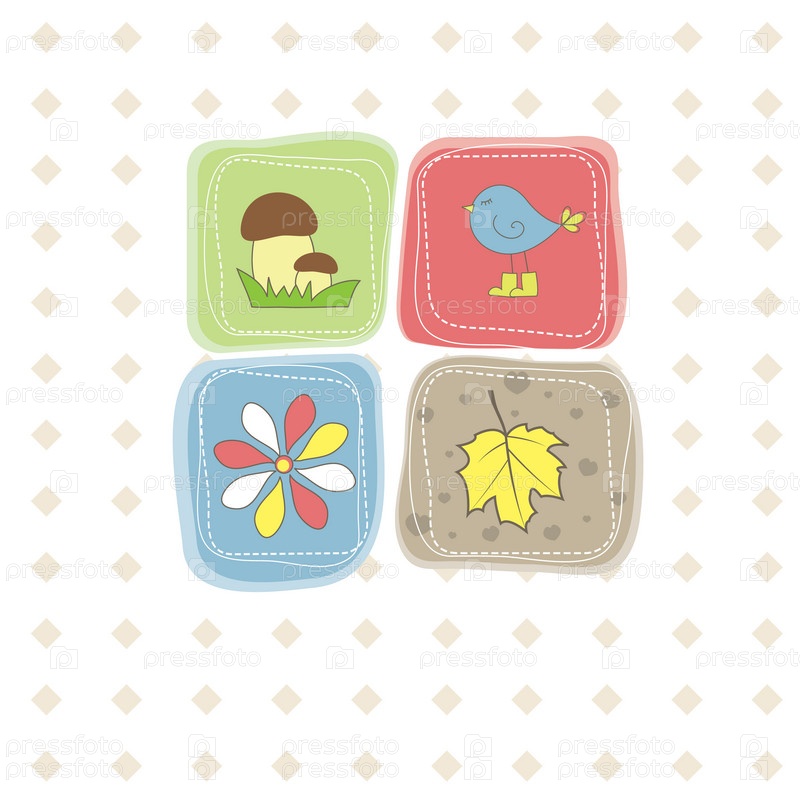 Открытка с цветком, птицей, грибом и листком на белом фоне