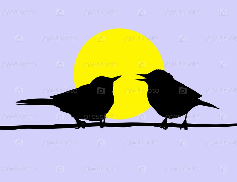 Две птицы сидят на ветви на фоне солнца