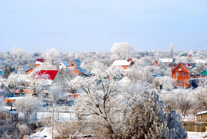 Деревня, покрытая белым снегом, на фоне голубого неба