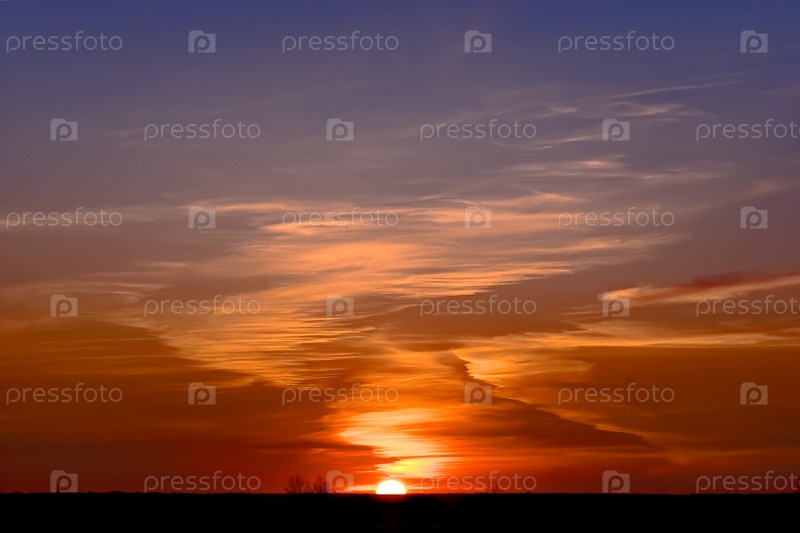 Радужное от заката небо и половина солнца на горизонте
