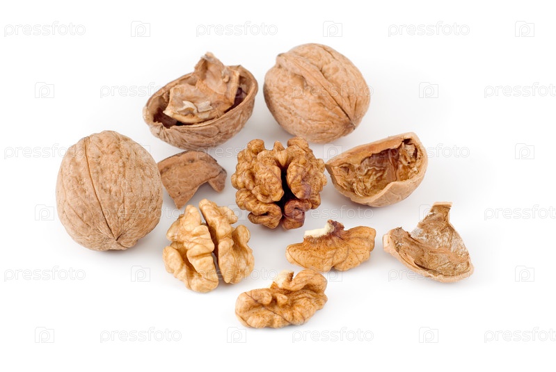 Два целых и два расколотых грецких ореха на белом фоне