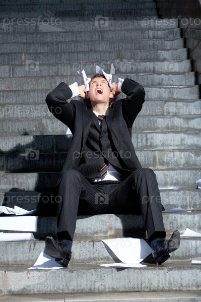 Расстроенный бизнесмен сидит на лестнице