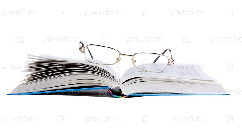 Раскрытая книга и очки на белом фоне