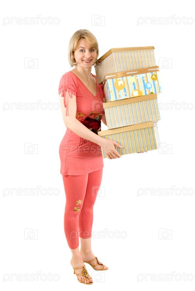 Женщина в розовой тунике и легенсах держит в руках четыре цветные коробки на белом фоне