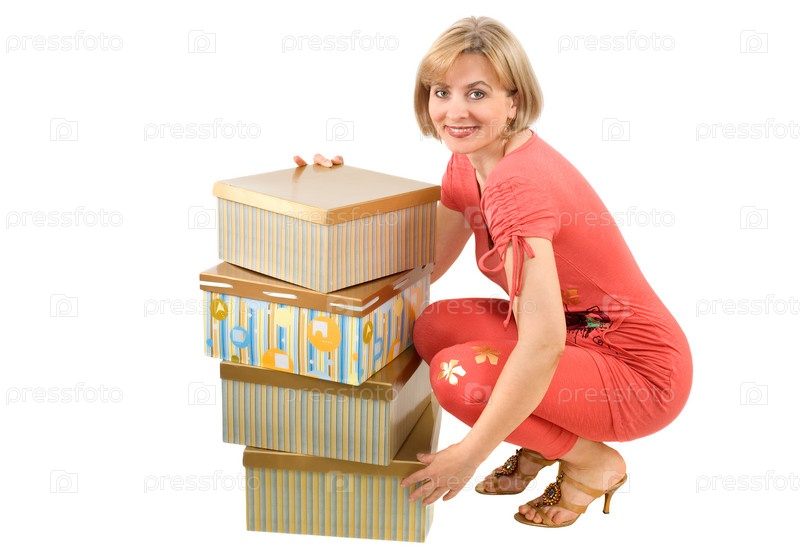 Женщина в розовой тунике и легенсах сидит возле четырех цветных коробок на белом фоне
