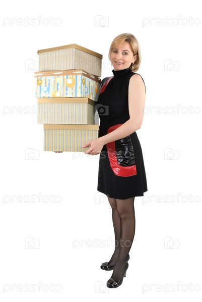 Женщина в черном платье без рукавов с красными карманами и черных капроновых колготках держит в руках четыре цветные коробки на белом фоне