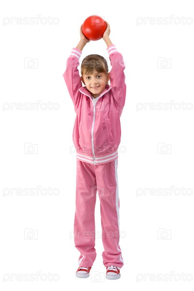 Девочка в розовом спортивном костюме с красным мячом на белом фоне