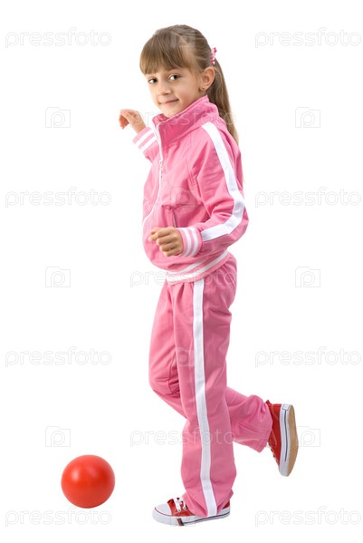 Девочка в розовом спортивном костюме играет с красным мячом на белом фоне