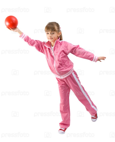 Девочка в розовом спортивном костюме стоит на одной ноге и держит красный мяч в противоположной руке на белом фоне