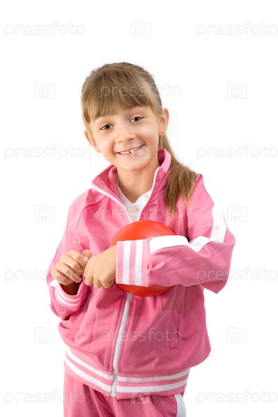 Девочка в розовом спортивном костюме с красным мячом на белом фоне