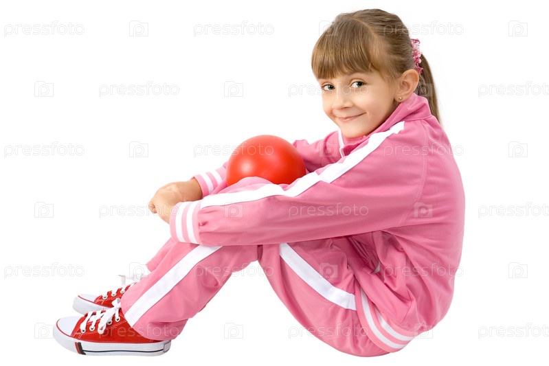 Девочка в розовом спортивном костюме сидит с красным мячом на белом фоне
