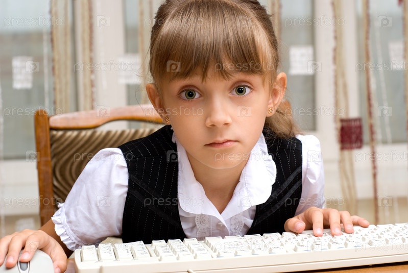 Удивленная девочка за столом перед клавиатурой на фоне зашторенного окна