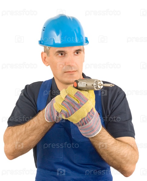 Мужчина в синем комбинезоне, синем шлеме и желтых перчатках держит дрель на белом фоне