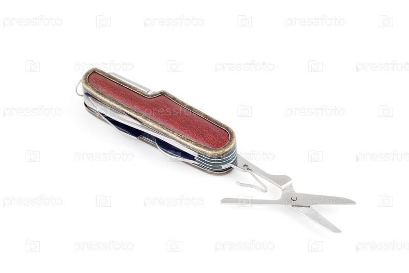 Складной нож с ручкой цвета красного дерева с набором лезвий на белом фоне