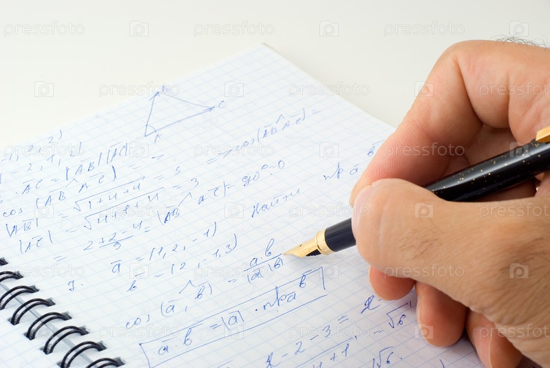 Мужская рука держит черную ручку с золотистым пером и пишет в тетради математические формулы