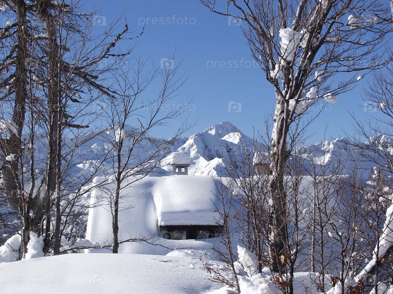 Домик в заснеженном лесу. Горнолыжный курорт Бовец. Словения