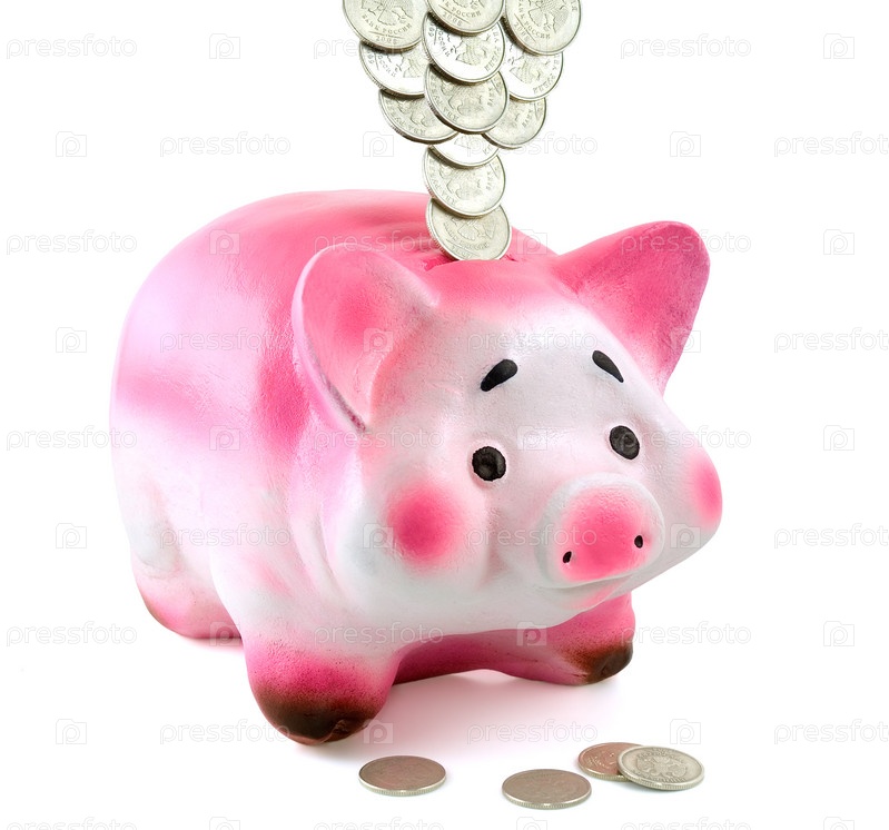 Денежные монеты над копилкой в форме бело-розового поросенка на белом фоне
