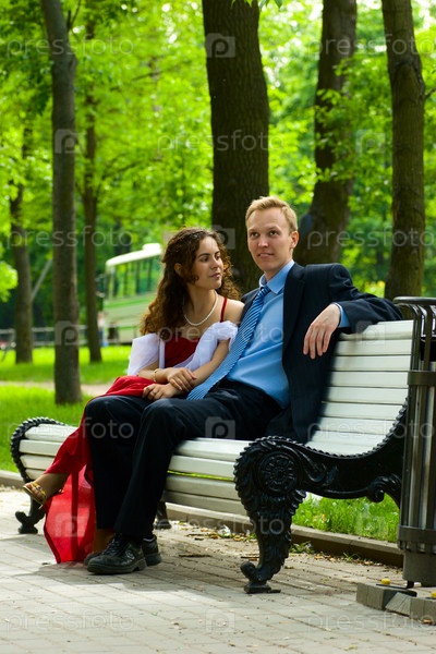 Молодая пара сидит на скамейке