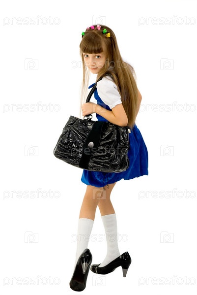 Девочка в маминых туфлях с сумкой в руках на белом фоне