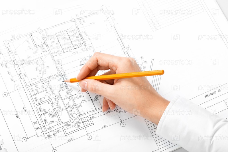 Рука с карандашом над чертежом