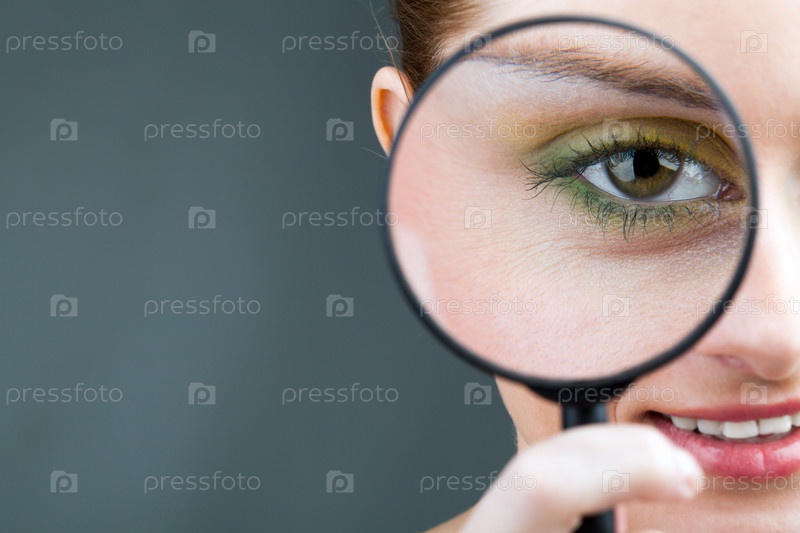 Портрет симпатичной девушки, смотрящей через лупу