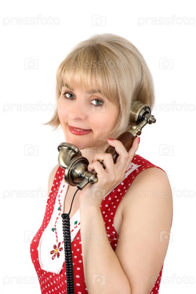Молодая девушка разговаривает по телефону на белом фоне