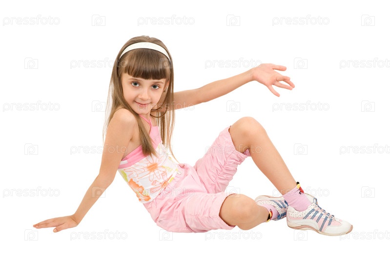 Девочка в розовой одежде сидит на белом фоне
