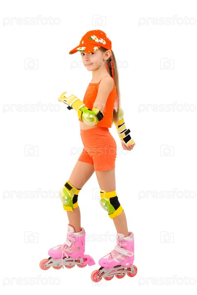 Девочка в оранжевом костюме и роликовых коньках на белом фоне