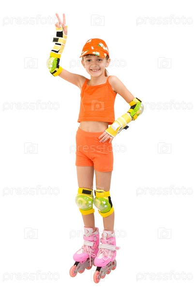 Девочка в оранжевом костюме и роликовых коньках на белом фоне