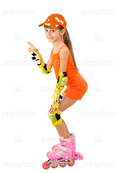 Девочка в оранжевом костюме и роликовых коньках на белом фоне