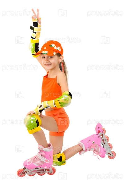 Девочка в оранжевом костюме и роликовых коньках на белом фоне