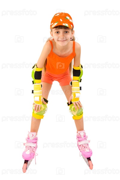 Девочка в оранжевом костюме и роликовых коньках на белом фоне