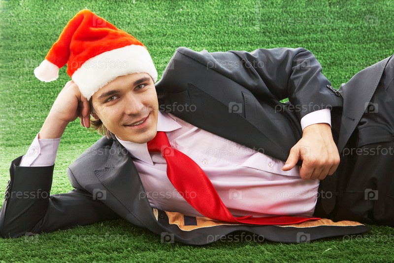 Молодой бизнесмен в колпаке Санта-Клауса лежит на траве