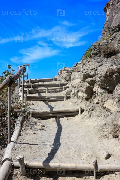 Горная лестница среди камней на фоне голубого неба