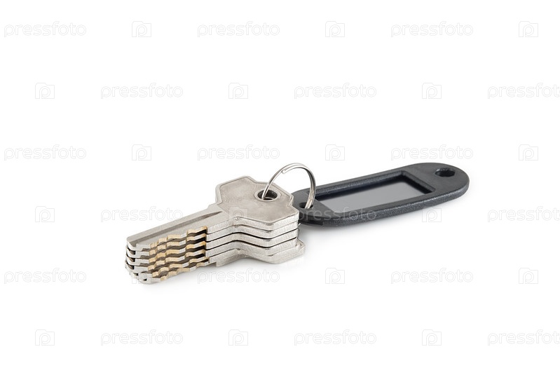 Связка из шести одинаковых ключей с черной биркой, на белом фоне