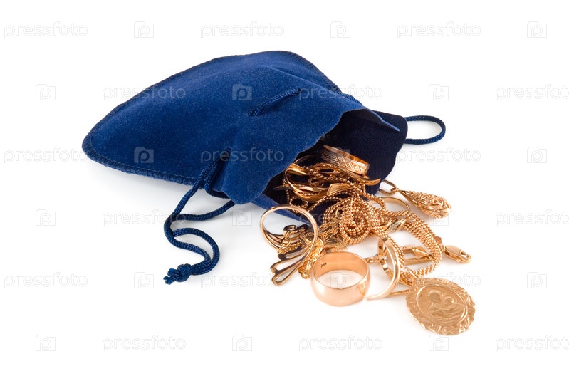 Золотые украшения высыпаны частично из темно-синего бархатного мешочка