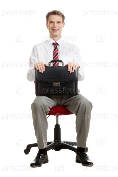 Молодой бизнесмен с портфелем сидит на стуле