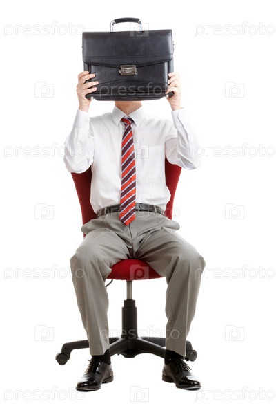 Бизнесмен закрывает лицо портфелем