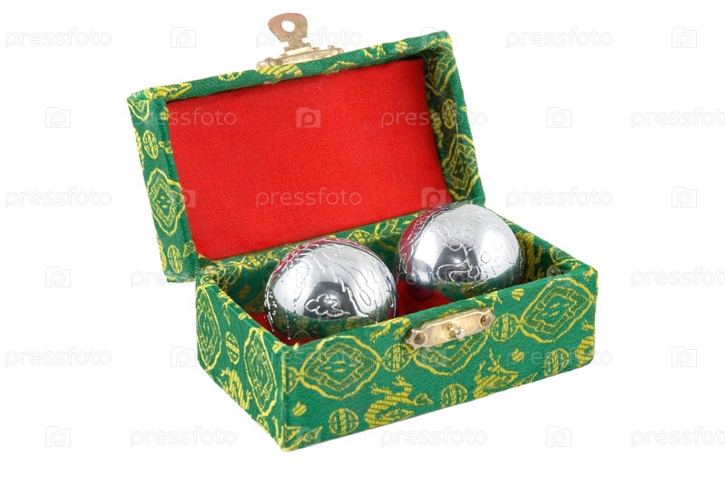 Два новогодних шара в зеленой шкатулке с красным бархатным дном на белом фоне