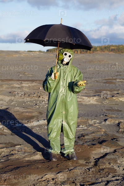 Ученый в костюме химзащиты стоит под зонтом и ждет радиоактивный дождь