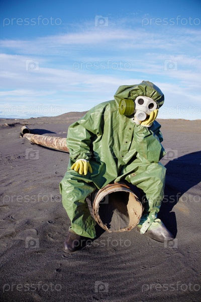 Эколог в костюме химзащиты сидит в пустыне на старой трубе