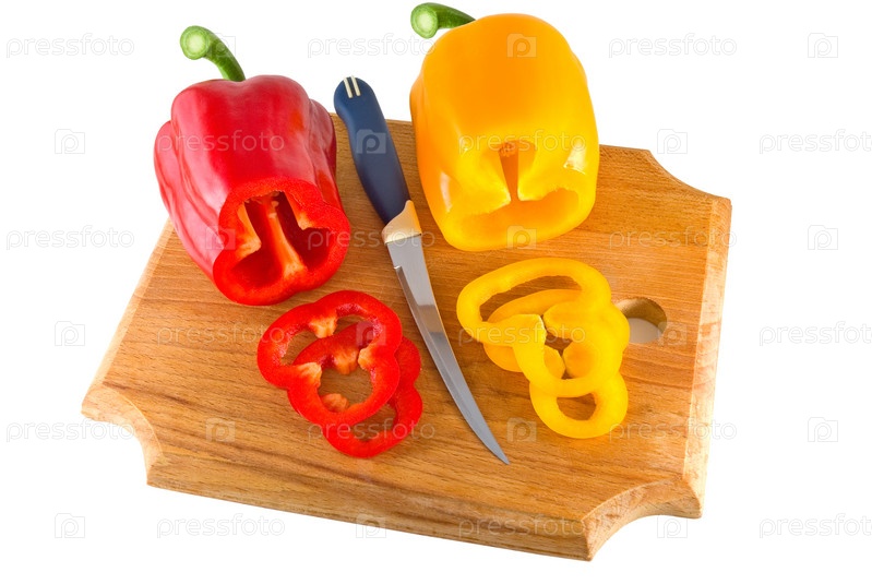 Кухонный нож лежит на деревянной кухонной доске между красным и желтым сладкими перцами на белом фоне