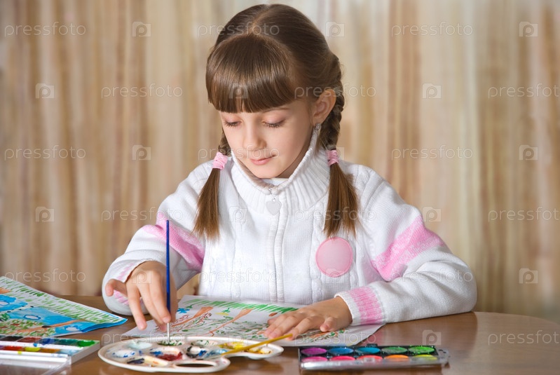 Девочка в шерстяной бело-розовой кофте сидит за столом с кисточкой и красками и рисует на листе