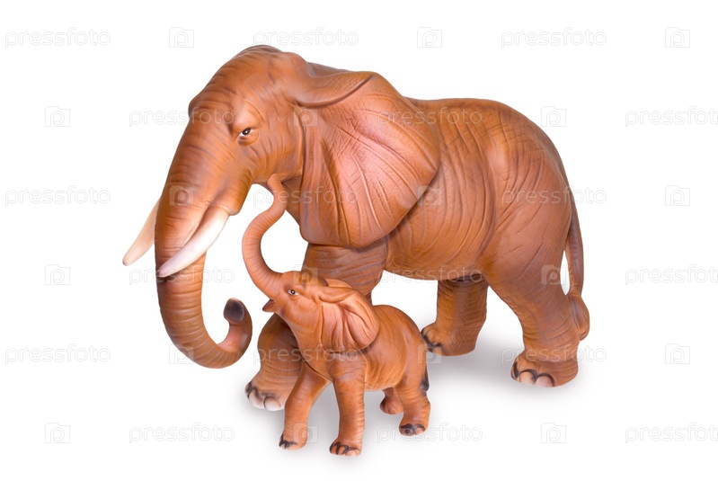 Две коричневые керамические статуэтки в форме слона и слоненка на белом фоне